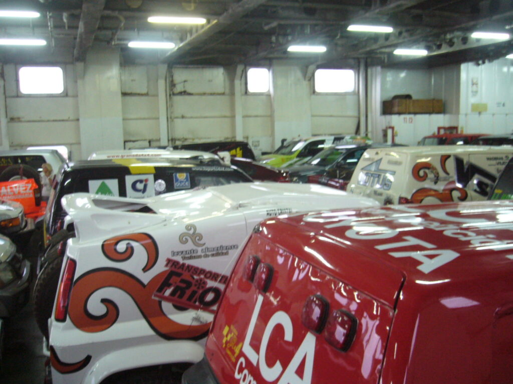 El viaje de ida, conocida la incomodidad del Land Cruiser por carretera, lo hicimos de tres tirones: cuando llevábamos unos 200 Km. estábamos en algún lugar de La Mancha de cuyo nombre no me enteré y paramos a comer. Doscientos kilómetros más tarde no aguantábamos más y nos bajamos a estirar las piernas. Y del siguiente empujón llegamos al puerto de Almería, con tiempo de charlar con otros equipos que ya estaban allí, cenar algo y echar una cabezada (Sí, se puede echar una cabezada en un coche de carreras. Todo consiste en pensar que a uno le espera un fin de semana duro e intenso, y que en el barco se va a dormir poco y mal).