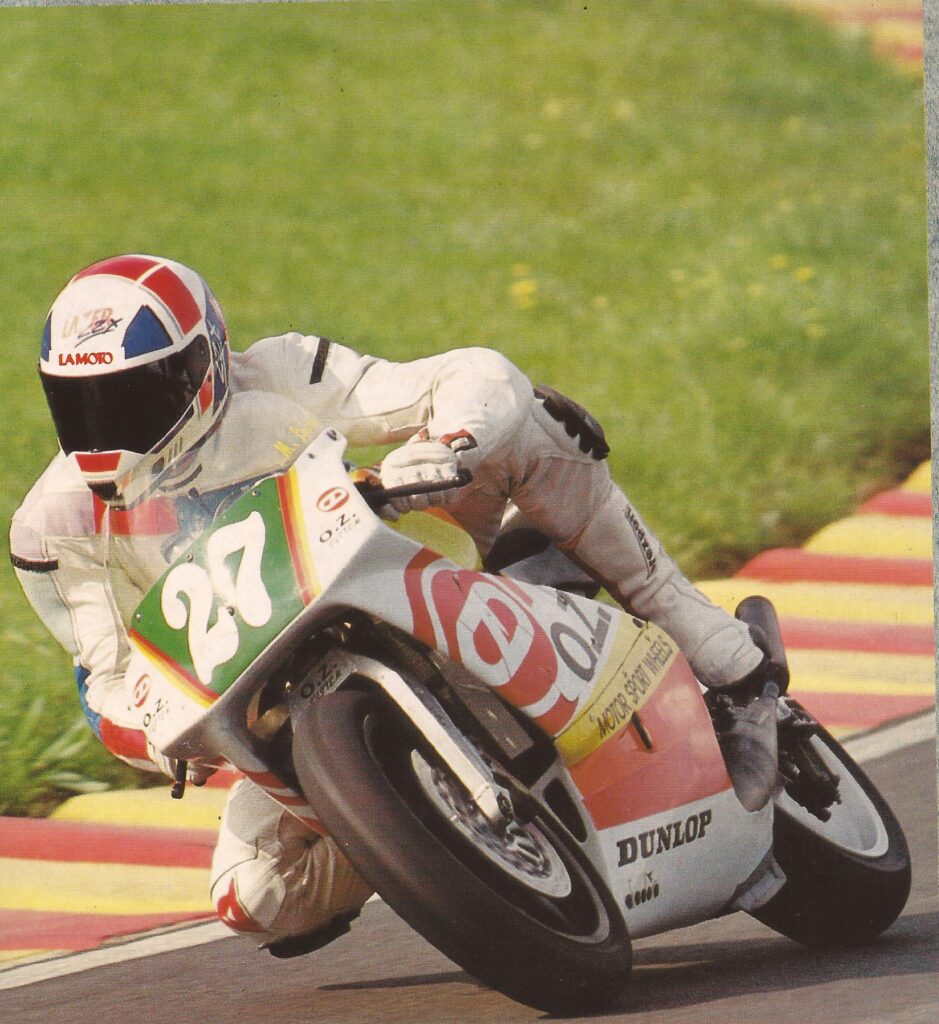 Por aquel entonces, las mejores motos que había probado eran algunas Bimota, junto con las EXUP y GSX-R de la época, y mi CBR1000F recién comprada. Para mí, aquellas motos eran lo máximo en sensaciones, estabilidad, confianza, potencia y disfrute. Por eso, cuando en aquella fría mañana de Diciembre del 91, con las montañas ya nevadas al fondo, me subí a la AF1 250 de Loris Reggiani, con su eterno dorsal con el 13, tuve que cambiar las referencias. Por un lado se encontraba el concepto de la moto: los 95 kilos de peso que dan otro significado a los 90 CV de potencia. Junto a esta ligereza, sus consecuencias: que la moto cambia de trayectoria lo mismo con el manillar que con las caderas o con la presión sobre las estriberas. Y además, un motor que sube como una centella hasta las potencia máxima a 12.300 rpm, y que permite llegar sin romperse a 13.500 rpm; unos frenos de carbono que dan al verbo frenar un significado parecido a la expresión chocarse con un muro; y unas suspensiones que empiezan donde acaban las de calle.