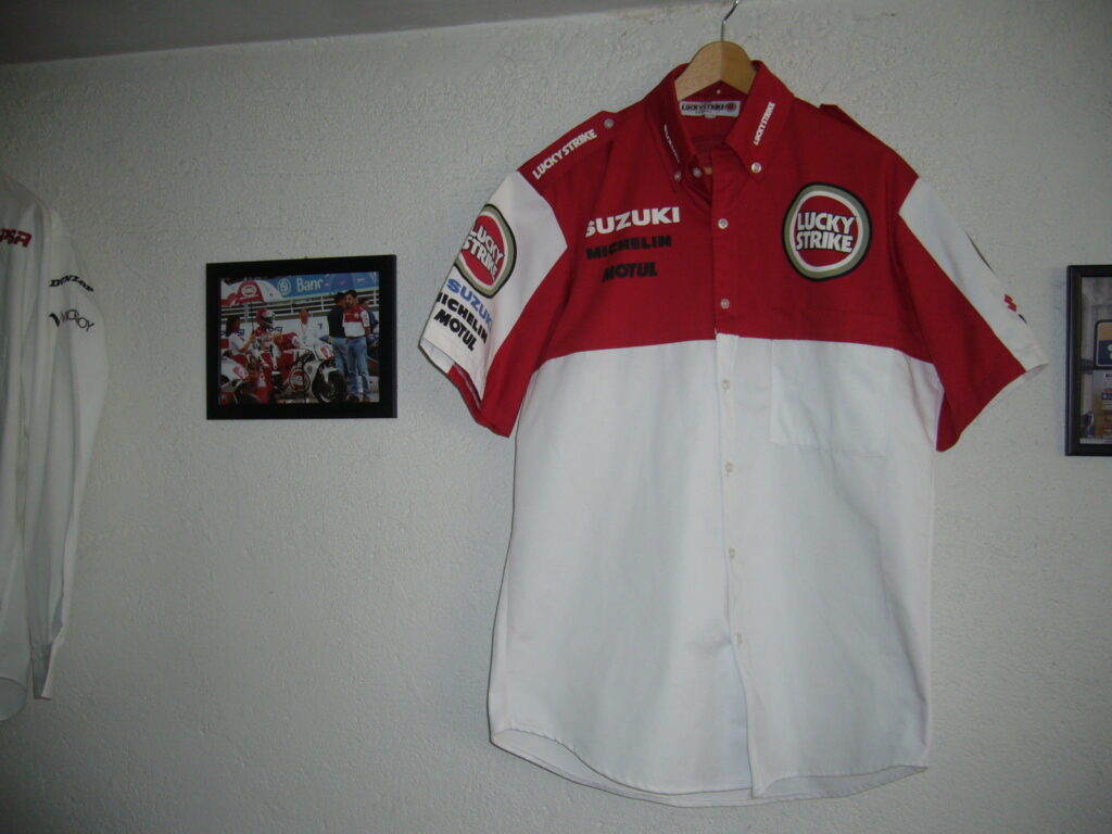 Al principio Juan no se aclaraba, porque cuando abría gas con ganas la moto subviraba, se le acababa el asfalto, y terminaba cortando. Alex Barros, el otro piloto de Suzuki aquel año le dio algunos consejos, y ni aun así hizo buenos tiempos. La conclusión a la que llegamos es que la única manera de ir deprisa con aquel trasto era llevarlo como Schwantz: abrir gas con tanta rapidez, casi con violencia, que se provocara un derrapaje en la rueda trasera que compensara el subviraje del chasis. Y hacerlo en cada curva de cada vuelta. Con resignación llegamos el domingo a la parrilla, sabiendo que el resultado no iba a ser gran cosa, aunque al menos íbamos a aprender. En la foto que conservo él está pensativo y yo serio, ambos uniformados de Suzuki Lucky Strike. El sabor amargo de la foto y de la camisa se debe a que Juan nos dejó unos meses más tarde por culpa de un accidente de carretera.