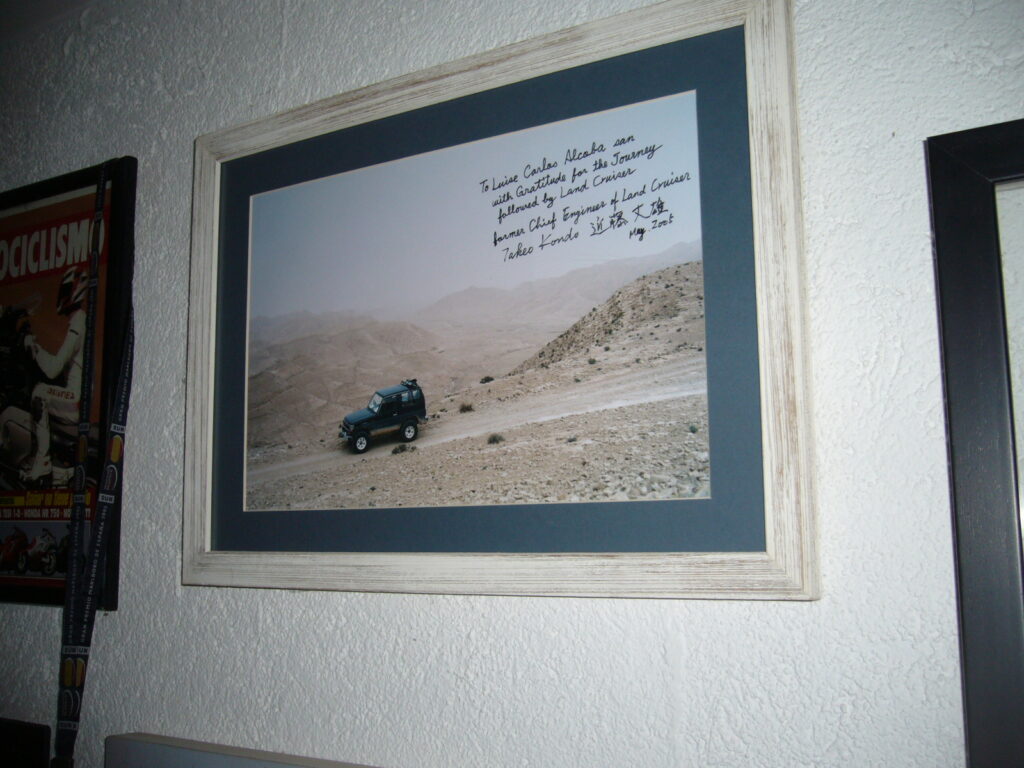 En la pared de enfrente hay una foto dedicada. Está tomada en una zona árida y montañosa de Túnez, y lo único que destaca entre los cerros pelados es el Land Cruiser LJ70 con el que hice un viaje formidable por aquel país en 2005. La foto me la dedicó Takeo Kondo, el ingeniero de Toyota que dedicó tantos años de su vida profesional a los todo terreno de la marca, que se le terminó conociendo como “Mr. Land Cruiser”.
