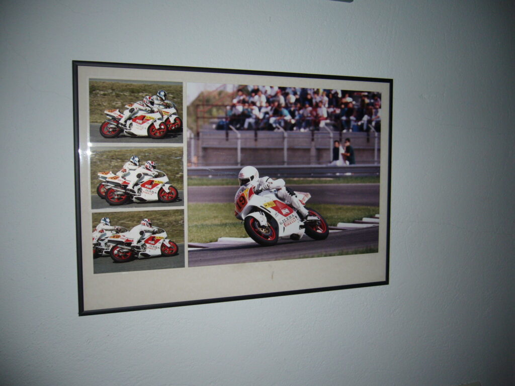 Estoy acabando la limpieza del garaje y ya solo me queda un cuadro, en el que hay varias fotos de mi temporada en la Copa Gilera. Unas de esas fotos muestran la secuencia de la curva de entrada a la recta de Jerez, una curva escenario de comentados incidentes, como el de Sete y Rossi, o el reciente de Lorenzo y Márquez. El tramo entre los dos codos consecutivos de Nieto y Peluqui y la meta era lo único que yo hacía bien en Jerez, y por eso le tengo cariño a ese ángulo y entiendo su dificultad. En las pequeñas Gilera 125 abríamos a fondo al salir de los codos y hacíamos las dos rápidas de detrás del “paddock” sin cortar. El desarrollo iba justo y la banda de potencia era estrecha, por lo que si se cortaba al entrar en alguna de las rápidas, al levantar la moto y por tanto alargarse el desarrollo el motor se moría y se perdía mucho tiempo. Como digo era lo único que se me daba bien, y sabía que si me acercaba a un rival al llegar a las rápidas, me lo comería en el corto tramo recto entre la segunda rápida y la horquilla, porque mi motor seguía empujando al no salirse de la estrecha banda de potencia. Ahí había que estar atento a lo que hacía el de delante: si se iba a la derecha para intentar una trazada redondita, se le pasaba por dentro. Si se ponía en el medio para tapar el hueco, me colocaba a la derecha para intentarlo por fuera. En la foto del garaje mi rival, muy conservador, llegó despacio y se fue al interior, y me dejó la trazada redonda de fuera.