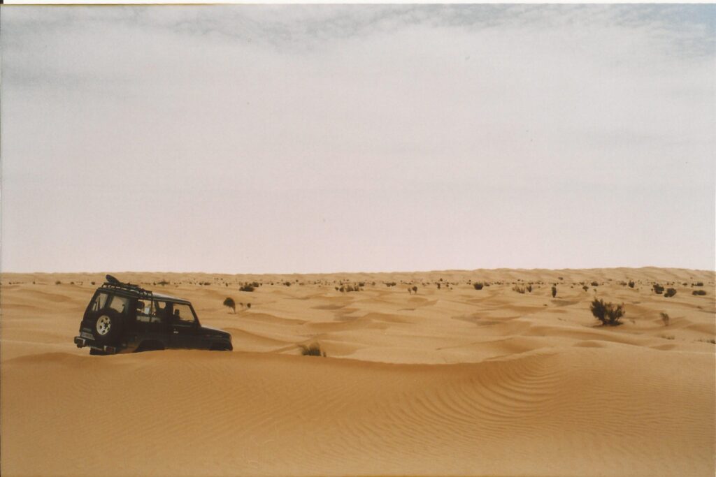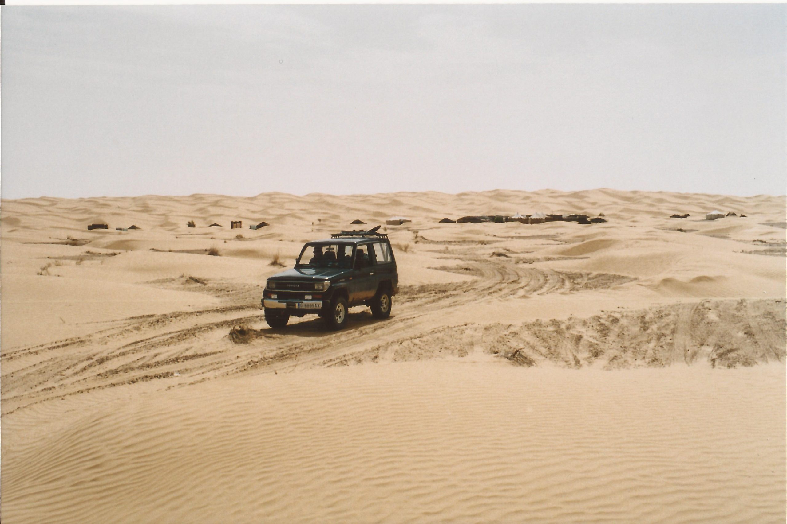 Era domingo y no lo sabíamos. Es más, nos daba igual. Lo importante era haber dormido en una cama y ducharse y desayunar con decencia, acciones que tienen un valor especial si el viajero duda sobre cuándo las repetirá. No es que el hotel de Douz, en Túnez, fuera gran cosa, pero me supo a gloria aquel día en que íbamos a dar una vuelta, breve, eso sí, al Gran Erg Oriental. Digo breve y debía decir brevísima, porque el recorrido que habíamos previsto para el día no llegaba a los trescientos kilómetros, y el Gran Erg Occidental tiene unos 190.000 km2 y ocupa parte de Túnez y de Argelia.