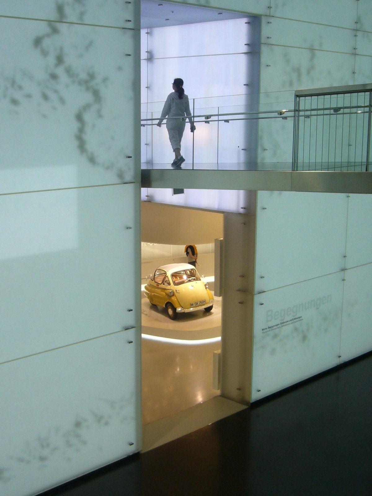 La siguiente etapa de mi peregrinación es la zona de la ciudad donde nació BMW, la fábrica bávara de motores. En las cercanías de la fábrica y de la oficina central se abrió en 1973 un museo que ha sido recientemente reformado, y al lado se abrió en 2007 (y se renovó en 2012) BMW Welt, un ostentoso edificio para acoger la actualidad del grupo en sus ramas: BMW motos y coches, Mini, Rolls Royce y ahora la rama i, los automóviles eléctricos. Por supuesto, confitado con tiendas, visitas organizadas incluso a la fábrica, tres restaurantes y un café y referencias permanentes a la imagen de marca, el futuro, la responsabilidad social y la sostenibilidad. Faltaría menos.
