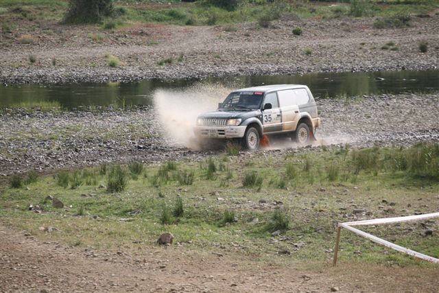 A 60 kilómetros del final del tramo nuestro motor volvió a fallar. La temperatura de refrigerante y la presión de aceite eran correctas, no había luces encendidas, ni tirones ni ruidos, pero el motor no estiraba. Con el estómago encogido llegamos al vadeo enorme que había a 43 km. de meta y, por los pelos, conseguimos pasarlo, aunque a punto estuvimos de sufrir el desdoro de quedarnos en el medio del río.