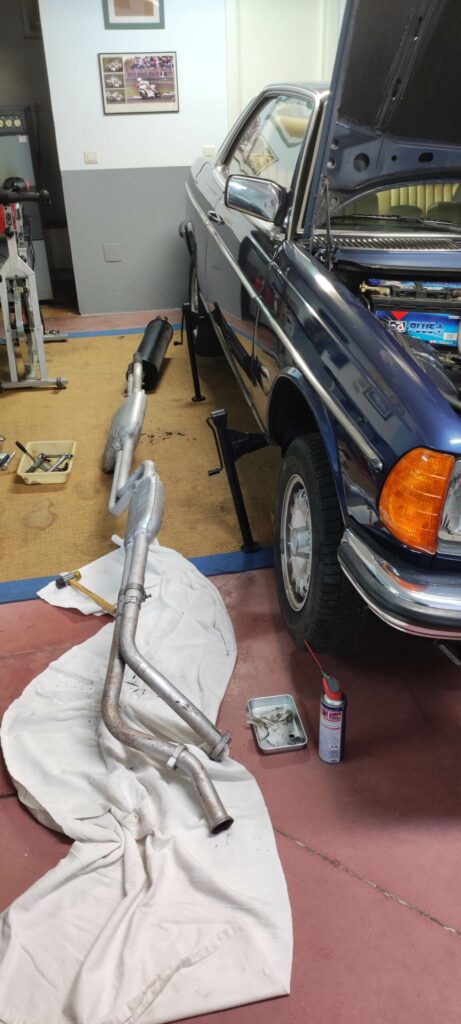 Empecé subiendo el coche por su lado derecho con los gatos originales de los dos Mercedes, y asegurándolo con un par de borriquetas. Apoyé el silenciador central y el final en otros dos gatos, antes de empezar a soltar las muchas fijaciones de la línea de escape: dos bridas con dos tuercas y dos tornillos cada una en la unión a los colectores en la culata; un apoyo en el cambio con un juego doble de tuerca, tornillo, arandelas y tacos de goma; más cuatro tirantes de goma en el silenciador final. Sí, esto se llama “over-engineering”, y volveré sobre ello más tarde.