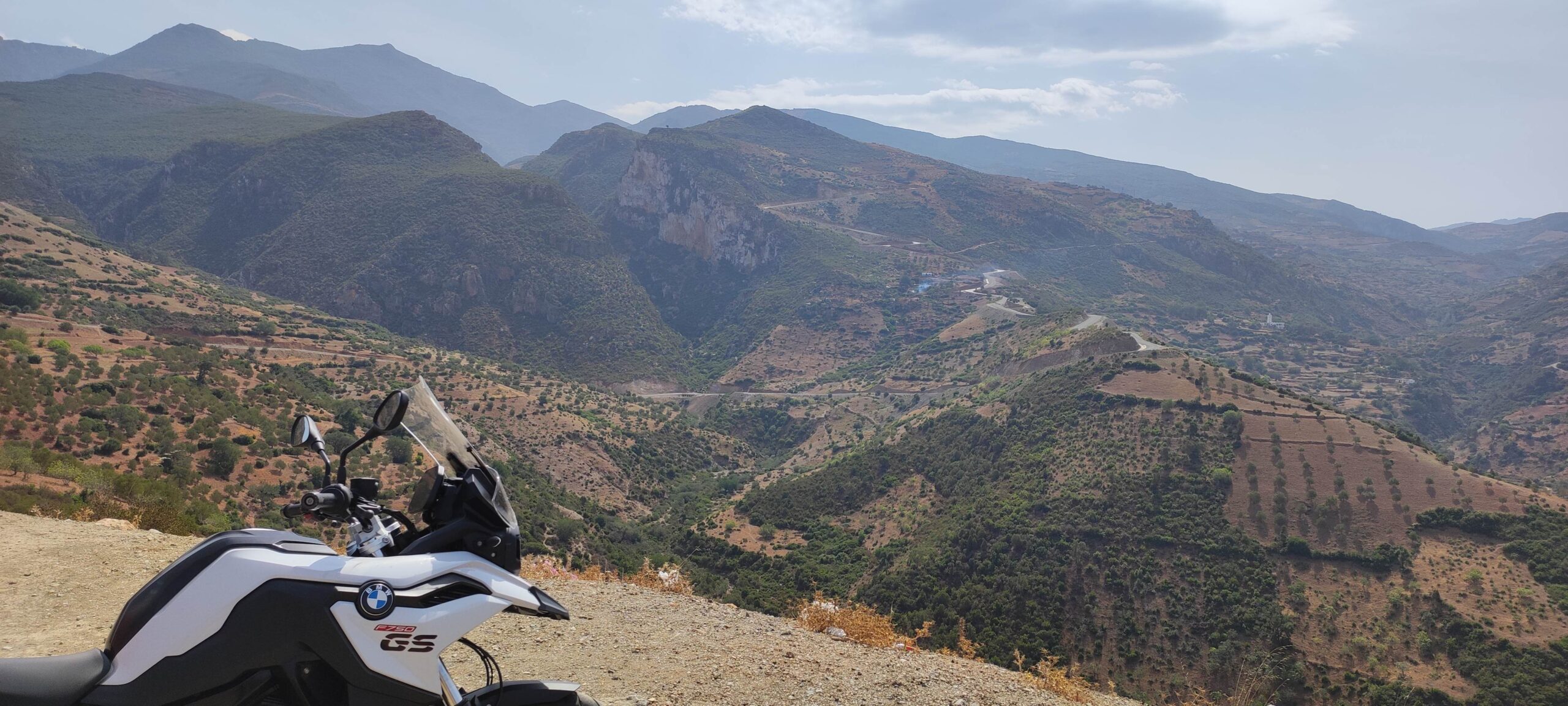 Huyendo de todo esto decido desviarme por una carretera estrecha y recomendada, la que en paralelo al oued Laou baja entre desfiladeros hasta el pequeño pueblo costero de Et-Tlete-de-Oued-Laou. El nombre abulta más que el pueblo, pero la carretera es una delicia, casi cincuenta kilómetros exclusivamente de segunda y tercera, entre cortados, barrancos y cerros. Para aderezar el recorrido a mitad de camino, en Es-Sebt-de-Saïd hay mercado, lo que quiere decir que no hay carriles, prioridades ni normas: motos, coches, furgonetas, camiones, burros y peatones nos mezclamos en la calle central, buscando cada uno el hueco ajustado a su tamaño para salir cuanto antes de allí. La ventaja de la moto en estas circunstancias es que necesita tan poco hueco como un burro y acelera más.