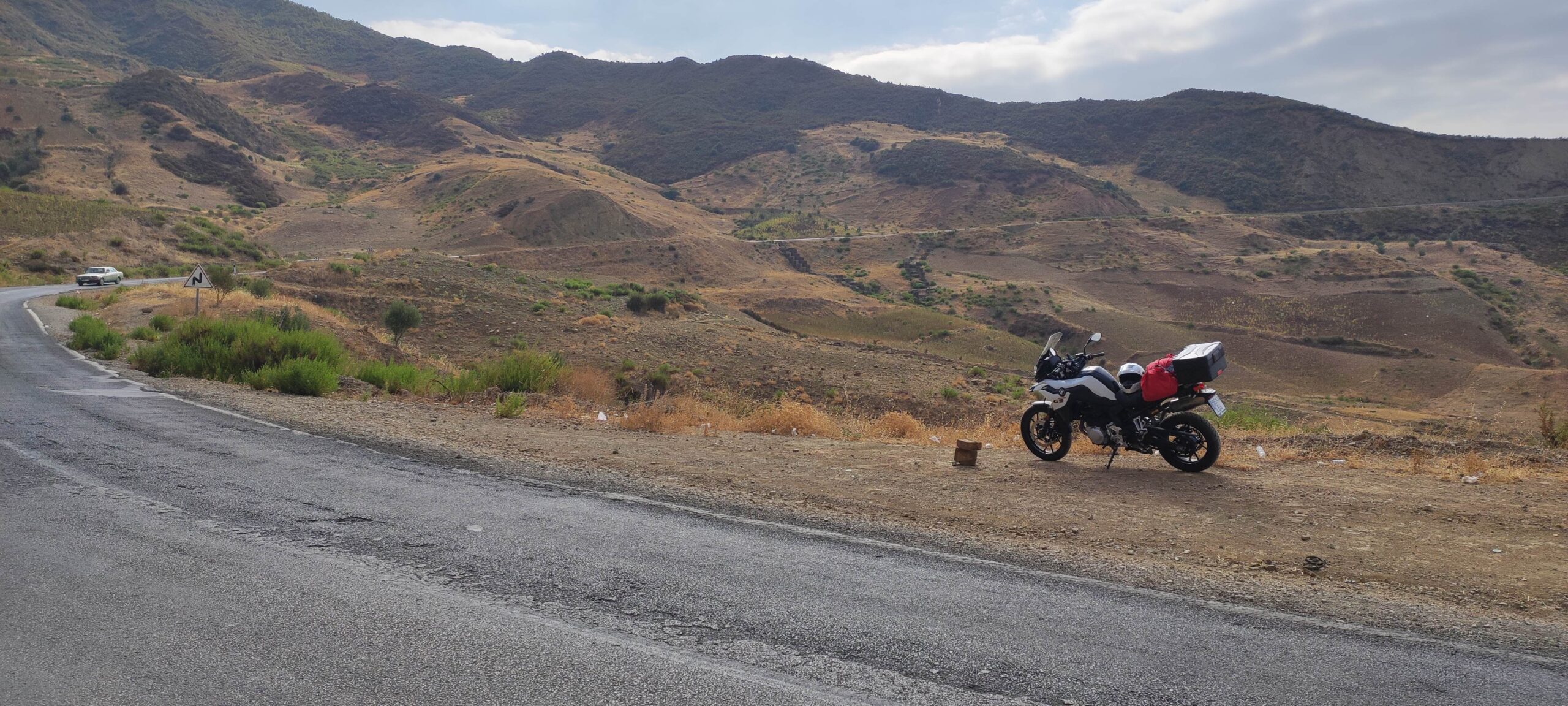 También de Tetuán a Chefchaouen iba a seguir la N16, la carretera de la costa, pero la peculiar señalización me lleva por la N2, la principal, que discurre por el interior. Los primeros kilómetros son de autovía, aunque con asfalto de escaso agarre. Poco más tarde se inician tramos de obras con la maquinaria al borde la calzada, tramos sin asfaltar, animales cruzando, … todo lo necesario para que no me aburra. En una zona decente entre dos de obras consigo por fin adelantar a un camión lento y, al rebasarlo, veo que ruedo nada menos que en cuarta a casi 90 km/h; comparado con el ritmo que llevaba me parece rápido y hasta peligroso, y en ese momento me pasa una furgoneta a más de 120 km/h.