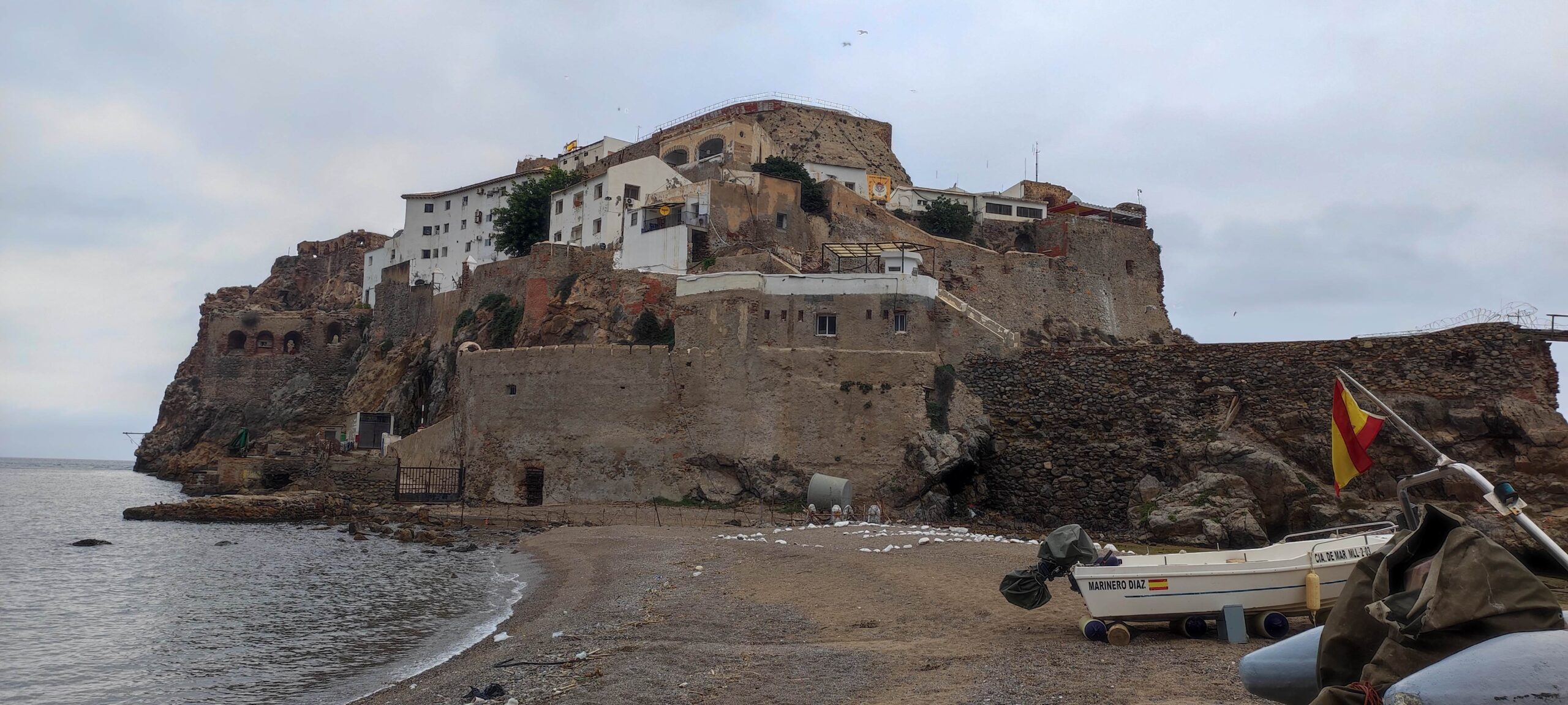 Bien cenado y mejor dormido arranco el día siguiente con uno de los objetivos duros del viaje, que me va a garantizar muchas horas de moto. Salgo de Chefchaouen en dirección este por la N2 para darme un atracón de curvas cruzando las montañas del Rif en dirección a Ketama. El inicio de esos casi cien kilómetros es formidable, con paisajes espectaculares entre barrancos infinitos, zonas de obras, asfalto como una alfombra arrugada y algún conductor de furgoneta con pocas ganas de llegar a viejo. Solo que doce km. después de Ketama tomo el desvío a Es-Sebt y el mundo parece cambiar. La temperatura baja a 18ºC, una niebla hecha de trozos, como de soplidos de dragón, ciega a ratos la carretera que sigue colgada de las montañas. Paso el recorrido completo sin ver un europeo en ningún medio de transporte, y casi ningún local. El estado del asfalto y el exceso de curvas hacen que me empiecen a doler los hombros cuando giro para tomar la N16 en busca de algo que parece sencillo: ver el Peñón de Vélez de la Gomera, esa roca territorio español desde que en 1508 Pedro Navarro, almirante castellano, decidió tomarlo porque era refugio de piratas marroquíes que asaltaban naves españolas.