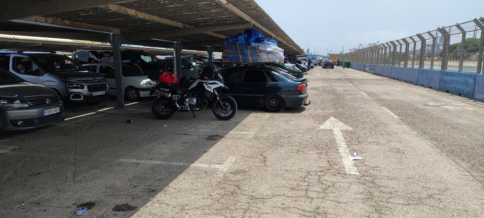 Después de más de una hora de espera se abrió la barrera que había al fondo del aparcamiento, y la Policía Portuaria nos permitió acceder, a los que cabíamos, en la siguiente zona, unos sesenta coches y mi moto. La única diferencia con el secarral anterior es que éste no tenía ni sombra ni baños.
