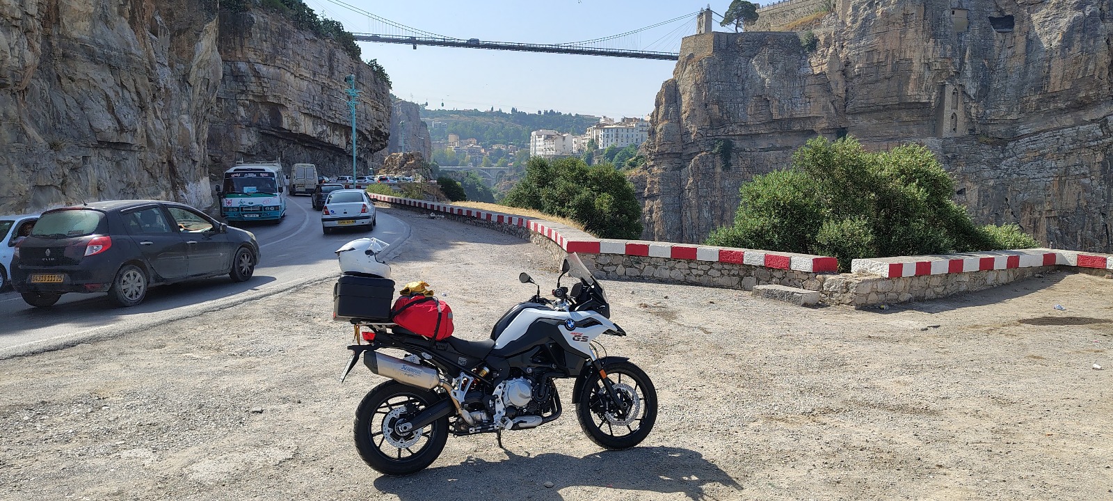 Sin embargo, no todo fue negativo en la conducción, ni mucho menos. Al placer de rodar en moto por lugares desconocidos, solitarios y poco frecuentados, al disfrute de ser la única moto durante muchos días y miles de kilómetros, se une el atractivo de los paisajes únicos. Si tuviera que destacar tres momentos de placer al manillar está claro que uno de ellos sería callejear por Argel y Orán, una vez que había memorizado lo más básico de su trazado y me desenvolvía con soltura, aunque sin bajar la guardia, por calles y plazas. Seguía pendiente del brillo del asfalto y de la importancia solo relativa de los semáforos, pero qué agradable era moverse libremente por esos barrios afrancesados del centro, que siempre acaban asomándose al Mediterráneo. Otro momento fantástico y a la vez inesperado tuvo lugar en Constantina, conocida como la ciudad de los puentes, porque está construida entre colinas, valles y barrancos que se comunican con enormes puentes. Asomado a uno de los más grandes, el puente Sidi M’Cid, vi abajo una carretera que serpenteaba junto al río Rhummel y que entraba y salía de túneles excavados a pico en la roca. No tardé en localizar en Google Maps la manera de llegar hasta allí, y a la mañana siguiente pude rodar encajado entre la montaña y el precipicio, entre túneles y bajo el puente.