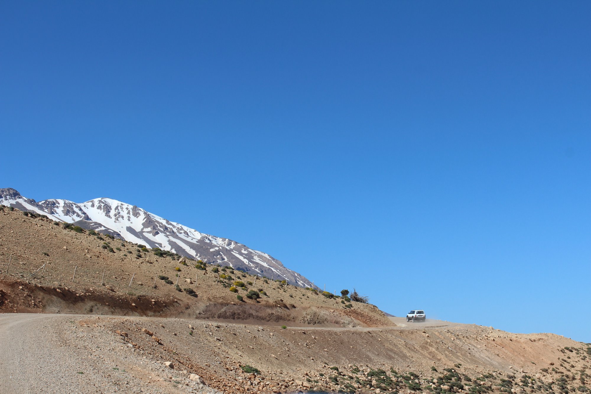 Lentamente la pista trepa por el Atlas marroquí, bajo un cielo azulísimo que enmarca las cumbres aun cubiertas de nieve. Ancha, lisa, nítida, con curvas amplias y precipicios infinitos, caracolea entre lomas y valles, produciendo esa adictiva mezcla de placer y miedo. Placer por el de la conducción suave, fluida, siempre en tercera hilando con suavidad los virajes. Miedo porque un error, un imprevisto, sitúa a dos toneladas y media de coche alto cerca del abismo.