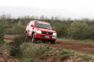 A estas alturas ya había hecho en varias ocasiones cosas que creía que no sabía hacer. Como enderezar el coche después de que haya deslizado hacia un lado, al compensar haya deslizado al contrario, al volver a compensar haya vuelto a deslizar, … y así en un angustioso movimiento de péndulo a cámara no tan lenta, en que el coche se tuerce a un lado y entre un ágil manoteo y golpes de gas se esfuerza uno porque el morro del coche y mis intenciones apunten al mismo sitio. Si escribo algunos números la magnitud del movimiento quedará más clara: pesamos el Land Cruiser en la báscula de la Federación durante las verificaciones de la carrera de Serón: 2.040 kilos, listo para correr, aunque sin copiloto ni piloto. La ficha técnica dice que, sin la rueda de repuesto en el portón, la longitud del vehículo es de 4.665 mm. Estamos hablando, por tanto, de un pequeño autobús, con el que no hay que pelearse, por el contrario hay que tratarle con cariño y algo de firmeza para que vaya donde uno quiere.