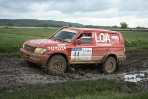 En el kilómetro 20 se averió el pedal del trip, por lo que desde ese momento Abel ponía a cero los parciales con la mano, si los baches le dejaban. En el 23 alcanzamos al Land Cruiser azul con el dorsal 46, que a su vez perseguía al enorme Patrol GR largo de Mickey Thompson. Con los coches casi siempre de lado y las cunetas embarradas diciendo ¡llámame!, no me atrevía a pasar a ninguno. Nos alcanzó nuestro rival el Range Rover rojo de Javier Pérez, y nos quedamos los cuatro en caravana hasta llegar a una zona de badenes ya en el km. 53. En cada badén cabía un Land Cruiser enterito, y allí conseguimos pasar al coche azul y