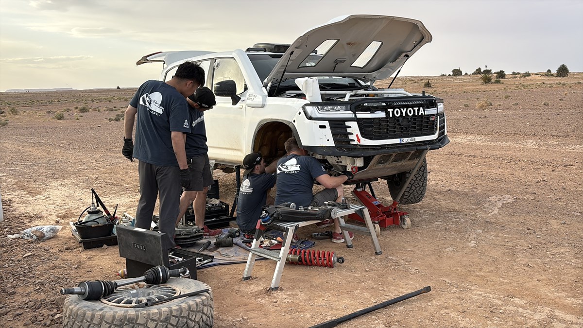 El Toyota Land Cruiser 300 GR Sport durante sus pruebas en Marruecos. Algo en esta foto dice que ha fallado la transmisión delantera derecha.