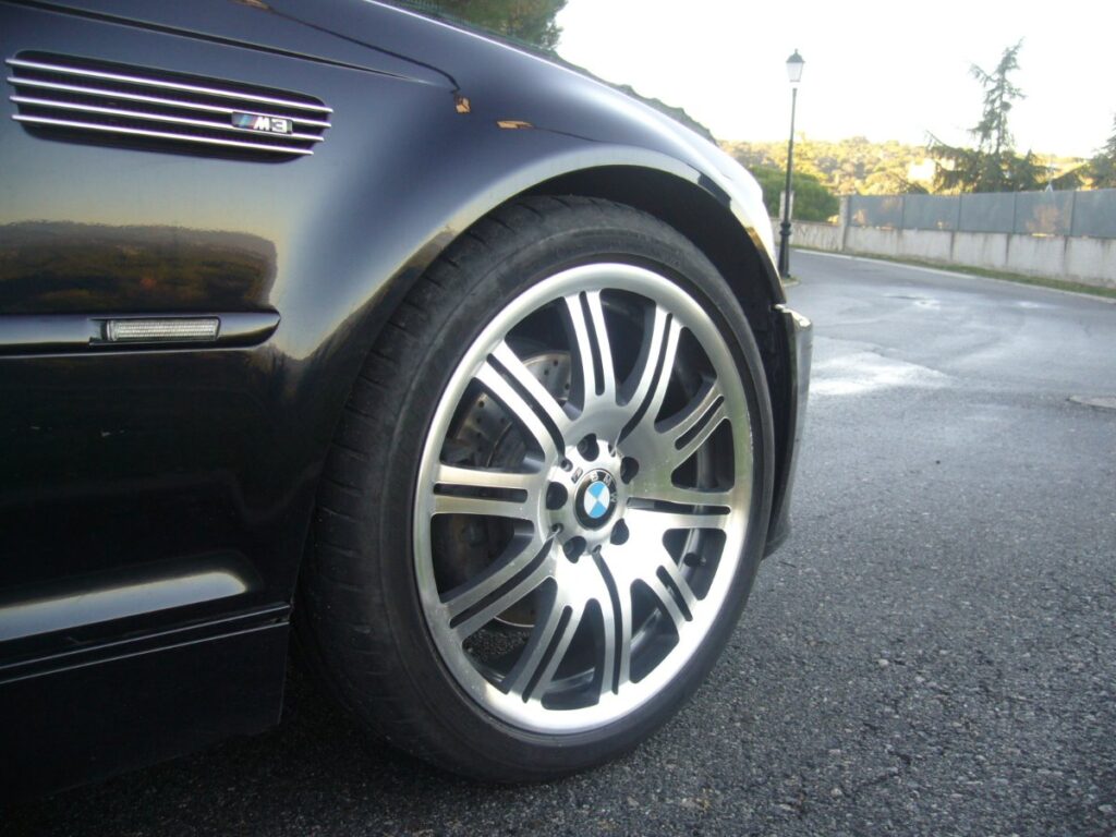 Unos días después afronté el siguiente paso en el proceso de venta del M3, porque las preciosas llantas de 19” presentaban posibilidades de mejora. En primer lugar, había desagradables marcas en los bordes, consecuencia de alguna maniobra de aparcamiento demasiado cercana al bordillo. Además, el anterior propietario había decidido unificar en color titanio el aspecto de las llantas de todos los coches de su colección, lo que chocaba con mi querencia a mantener de estricta serie todos los que tengo. A través de un Concesionario de Toyota, me puse en contacto con taller especializado en estas lides, que en apenas tres días hizo un resultado excelente, aunque no del todo barato. Pulieron las llantas para eliminar la pintura que no me gustaba, repararon los daños, y aun fueron capaces de equilibrar, y de reponer los pequeños escuditos con la M. Una vez montadas, el M3 recuperó el aspecto original, con un brillo luminoso en las ruedas contrastando con el color oscuro “Diamantschwarz Metallic” de la carrocería y el negro de la capota, y a juego con los cromados discretos, en especial el de las aletas delanteras que homenajea al maravilloso 507 del Conde Albrecht von Goertz.