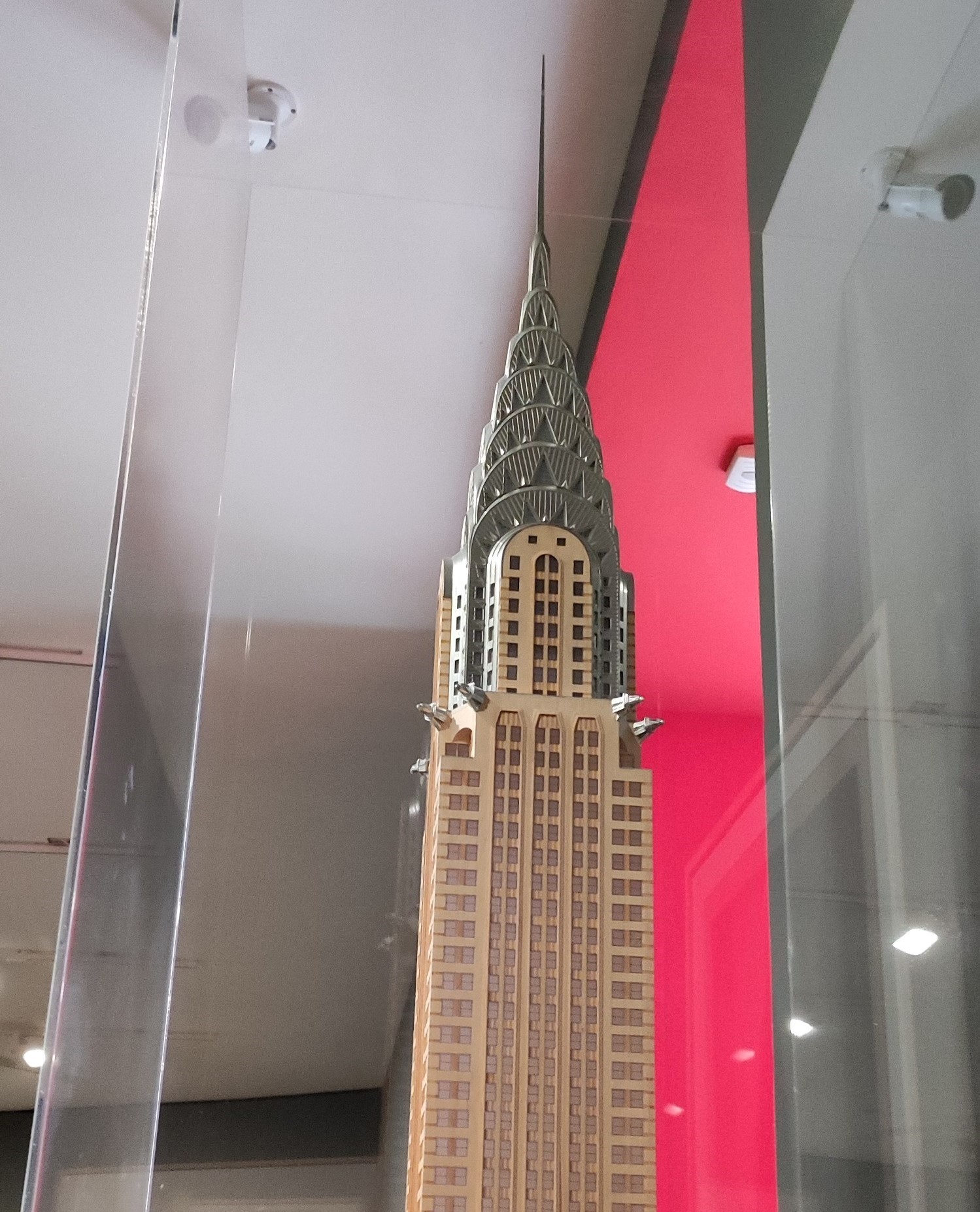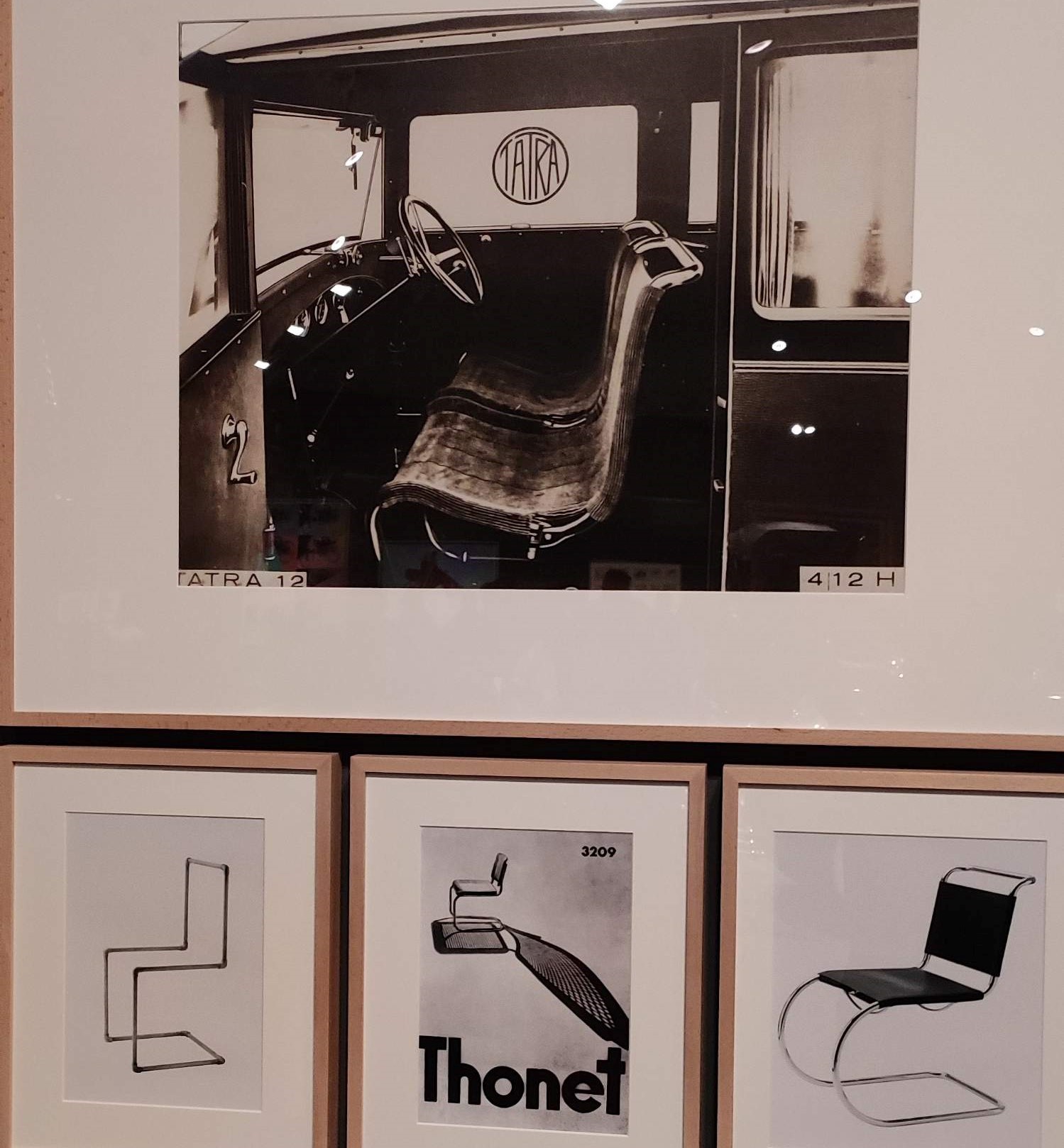La zona de la exposición que, a mi juicio, mejor relacionaba automóviles, arte y arquitectura estaba en la sección “Beginnings” (Inicios). Junto a una maqueta del edificio Chrysler, construído en Manhattan en 1930, con sus gárgolas Art Deco y los arcos de las últimas plantas que recuerdan radiadores de coches. A su lado, fotografías de sillas diseñadas en la época por Marcel Breuer, Mies van der Rohe y Mart Stam, cuyas réplicas todavía se fabrican. Y frente a ellos, un Chrysler Airflow (1934) y un Tatra T87 (1948), que reproducen en sus carrocerías aerodinámicas las formas del edificio Chrysler, y en sus asientos las sillas de moda en aquellos días.