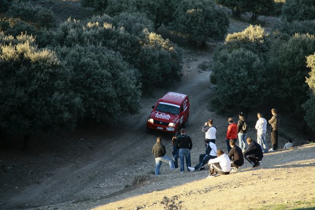Las horas de tramo pasaban, encerrado en el mínimo espacio compartido con Quique, los extintores, el Terratrip, las notas …, y sin detenernos. El cuerpo encajado en el bacquet, más el arnés de cuatro apoyos, el casco y el Hans, más los baches y los saltos, me comprimían, y cuando solo llevaba unos cientos de viñetas del rutómetro, comencé a tener ganas de parar. Muchas viñetas después tenía muchas ganas de parar. Lo curioso es que el cuerpo pasa a una especie de función de emergencia, y las ganas se convierten en dolor, allá en el bajo vientre, pero no me podía comprimir para mitigar el dolor por culpa del bacquet y los arneses que, precisamente ellos, eran los que me producían el dolor por no parar.