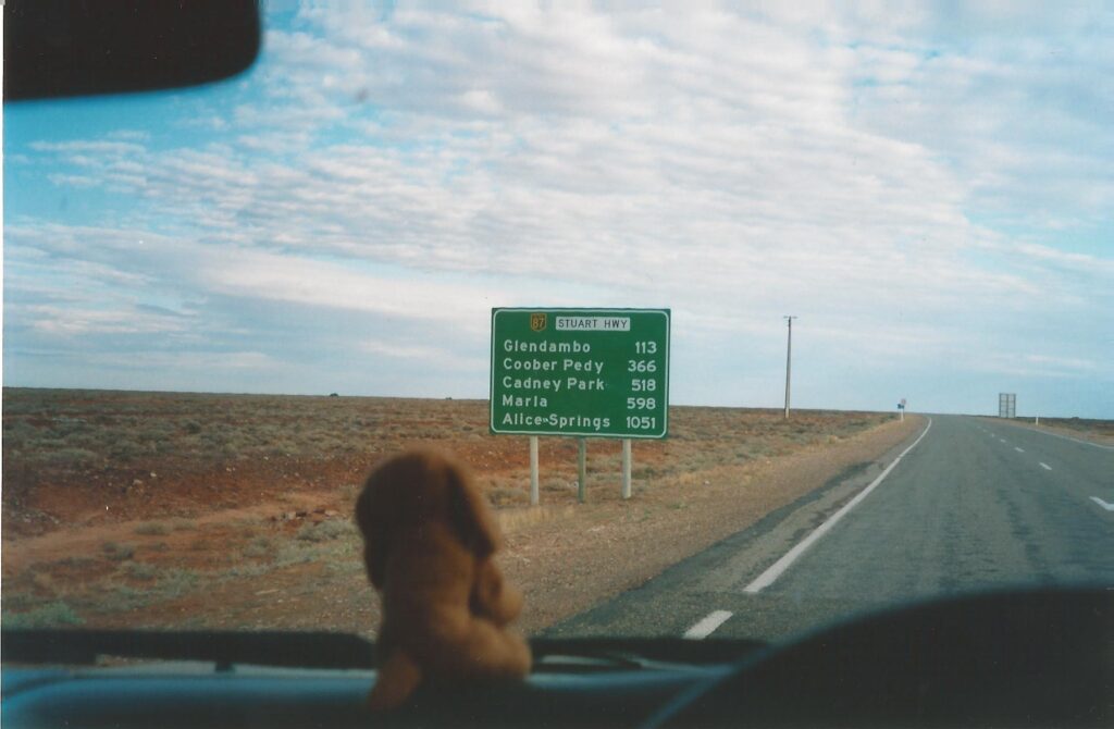 Acabada la compra, sentamos encima del cuadro de instrumentos a “Aussie”, un pequeño perro de peluche que habíamos comprado la tarde anterior en una juguetería del centro de Adelaida y que, desde entonces, es la mascota oficial de nuestros viajes. Y así de pertrechados tomamos la Stuart Highway, que a pesar de su nombre es carretera y no autopista. Al principio recorrimos las zonas habitadas de los alrededores de Adelaida: casas de una planta con jardín en urbanizaciones de aspecto relajado, niños jugando y, en general, esa tranquilidad propia de la vida australiana. Luego llegaron los pueblecitos salpicados entre colinas verdes, en ocasiones situados frente al mar. Y siempre encontrando de vez en cuando gasolineras, restaurantes y centros comerciales.